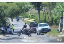 Pemblokiran dilakukan dengan memarkir sepeda motor dan bambu serta ditanami pohon pisang.