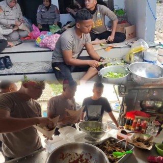 Dengan peralatan lengkap dan tenaga personel yang siaga, petugas menyiapkan makanan untuk para warga, termasuk anak-anak, lansia, dan kelompok rentan lainnya.