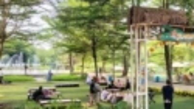 Di sini, kamu bisa menemukan kolam ikan besar di tengah taman, jogging track di tengah pepohonan rimbun, alat olahraga, dan area playground untuk anak.
